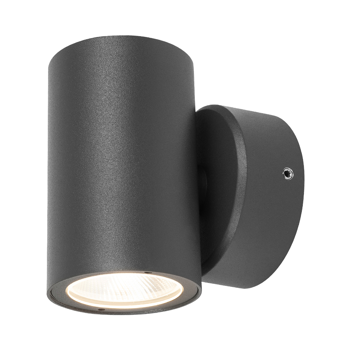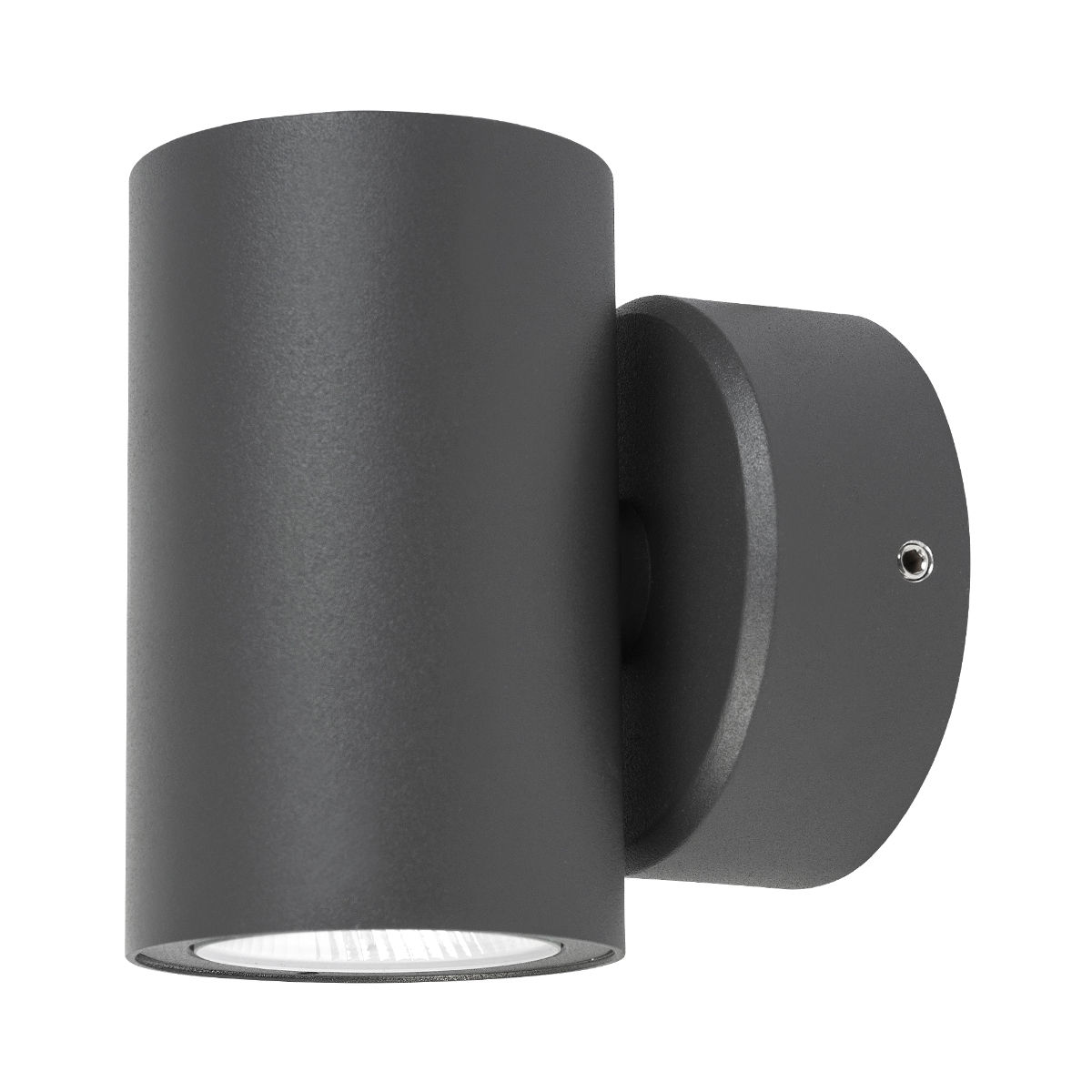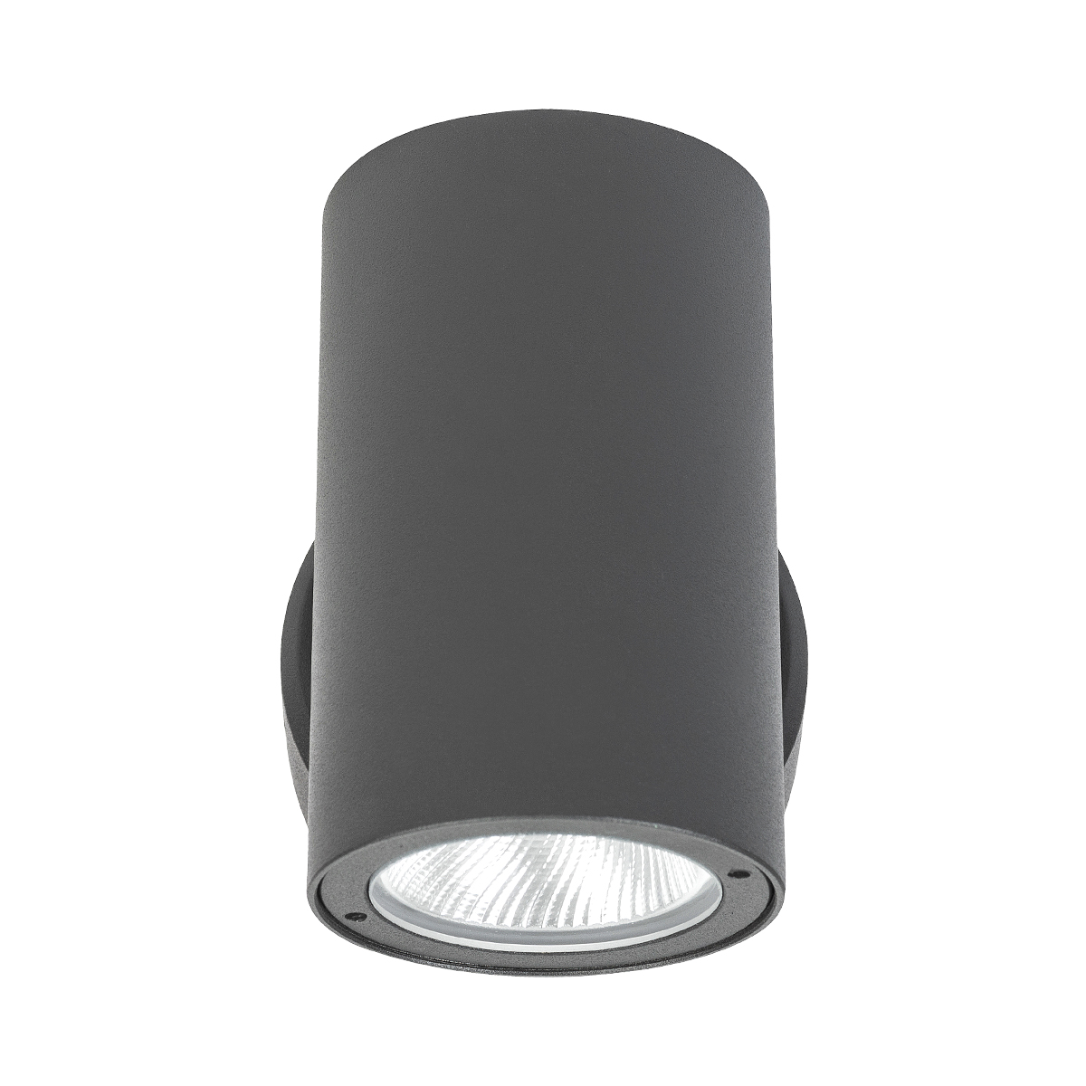 Luminaria LED terminado grafito para sobreponer en muros de exterior, ilumina hacia arriba y hacia abajo.