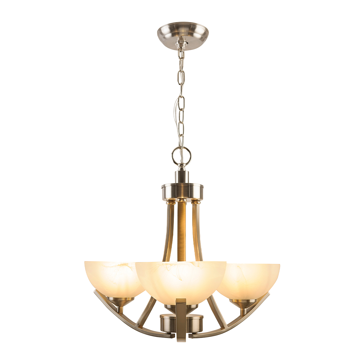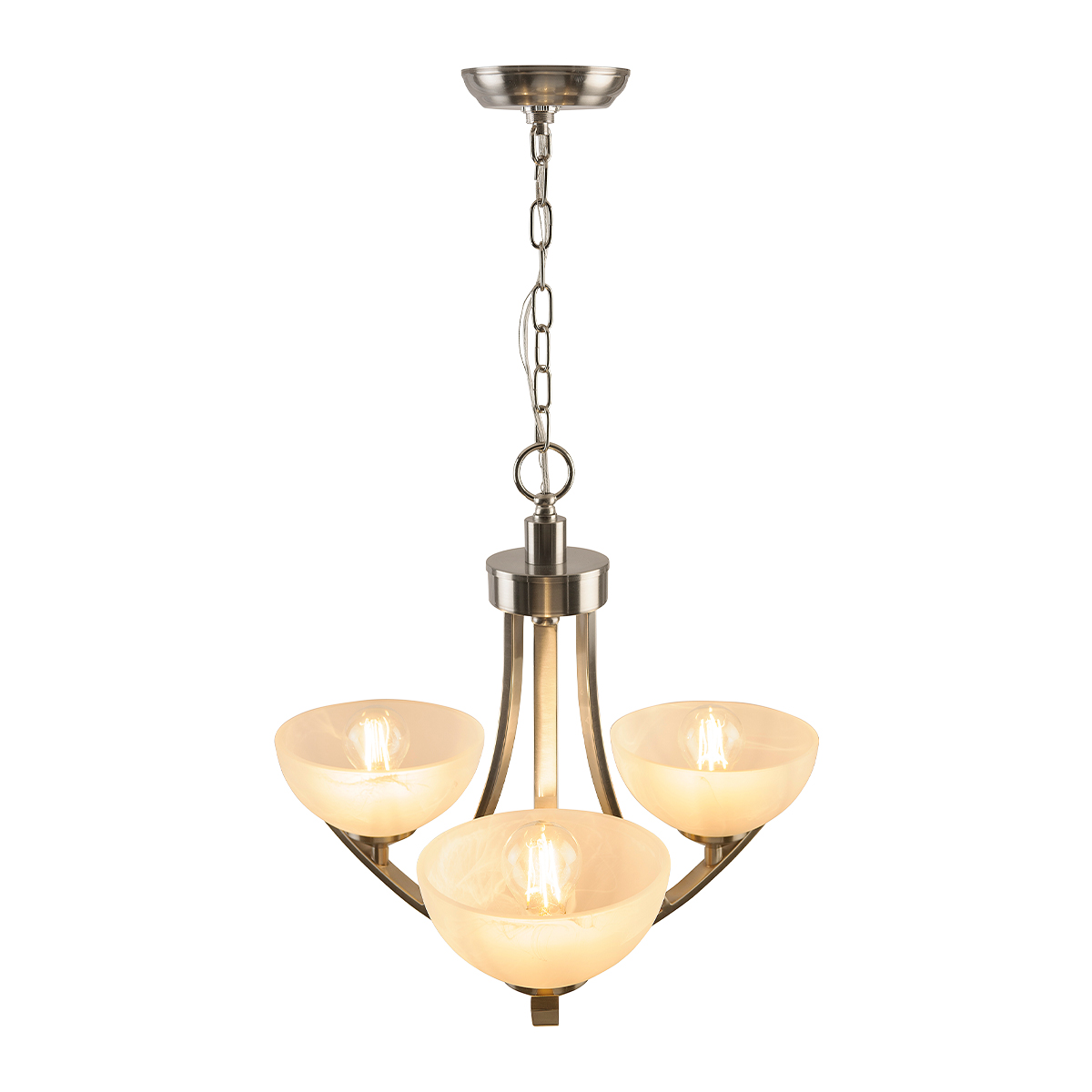 Candil atemporal de acero y pantallas de cristal de tres luces.